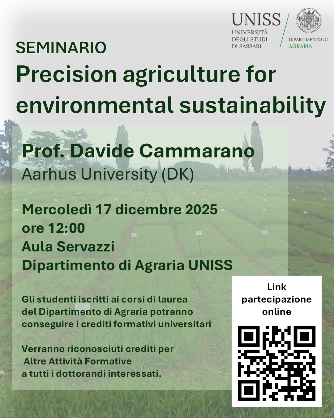 si segnala che nell’ambito del bando Visiting Professor 2025 di Ateneo, il Prof. Davide Cammarano (Aarhus University, DK), terrà un seminario dal titolo: "Precision agriculture for environmental sustainability".