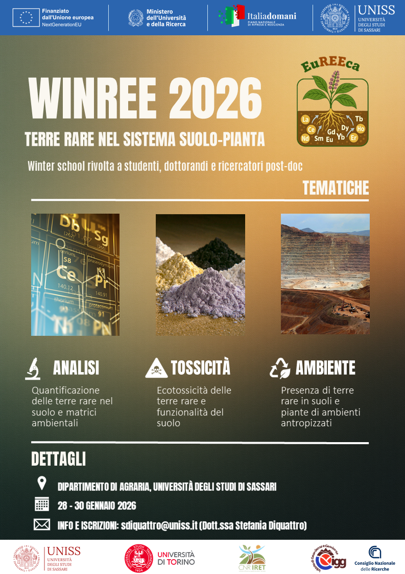 Winter School "WINREE 2026" Sassari, Viale Italia 39/A, Dipartimento di Agraria - UNISS, Aula Pampaloni 28 Gennaio 2026 - 30 Gennaio 2026 09:30 Si avvisa circa il prossimo avvio della Winter School “Terre Rare nel Suolo e Impatto Ambientale”, organizzata nell’ambito del progetto PRIN Eureeca, che coinvolge le Università di Torino e Sassari e il CNR. La Winter School sarà un’occasione formativa avanzata dedicata a studenti delle lauree magistrali, dottorandi, post-doc e ricercatori che desiderano approfondire le conoscenze sul comportamento geochimico, ecotossicologico e ambientale delle terre rare (REE) presenti in suoli contaminati. Attraverso seminari teorici, workshop pratici e momenti di confronto con i docenti partecipanti, la scuola affronta le tematiche relative a quantificazione, mobilità e speciazione dei REE nei suoli, il loro impatto sull’attività microbica e biochimica nel suolo, nonché le strategie di monitoraggio e recupero. L’obiettivo è promuovere un approccio multidisciplinare e integrato per comprendere e gestire le sfide ambientali poste da questi contaminanti emergenti. Questa esperienza formativa favorisce lo scambio scientifico e la costruzione di rete tra giovani studiosi, contribuendo a sviluppare competenze avanzate e innovative nel campo della scienza del suolo e dell’ecotossicologia delle REE. CONTATTIStefania Diquattro - sdiquattro@uniss.it LOCANDINA