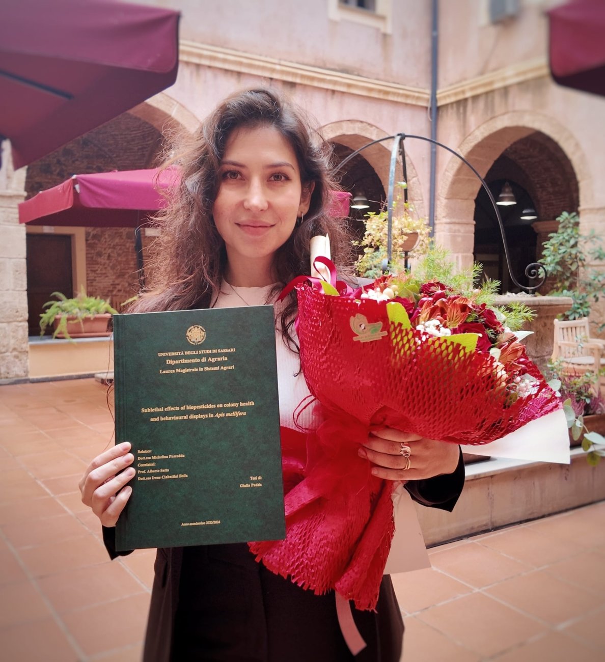 Premiazione migliore tesi in Sardegna in scienze agrarie, alimentari e/o forestali 31 Ottobre 2025 In data 31 ottobre 2025 presso il Chiostro del Carmine a Oristano è stato consegnato il premio di laurea 2024 ADAF (Associazione Dottori in Agraria e Forestali della Sardegna) alla dottoressa Giulia Pudda per la sua tesi magistrale in Sistemi Agrari dal titolo: "Sublethal effects of biopesticides on colony health and behavioural displays in Apis mellifera". Questo studio ha infatti, valutato gli effetti dei biopesticidi sulla salute e sul comportamento di colonie di api da miele. Un riconoscimento per la nostra studentessa, ma anche per tutto il gruppo di apidologia che ha lavorato a questa tesi: la relatrice la dottoressa Michelina Pusceddu e i correlatori il Prof Alberto Satta e Irene Ciabattini Bolla del Dipartimento di Agraria, dell'Università degli Studi di Sassari. CONTATTIMichelina Pusceddu - mpusceddu@uniss.it